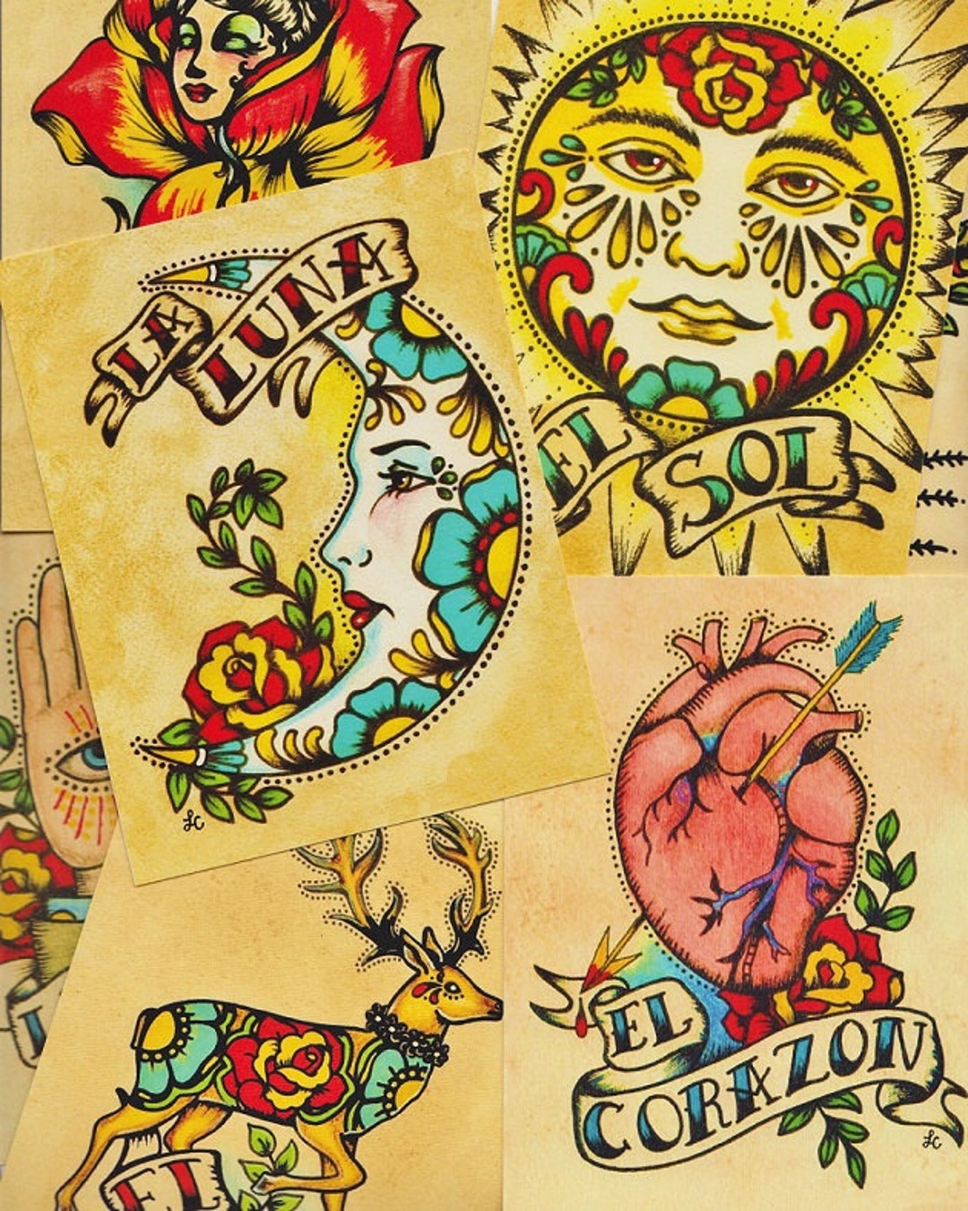 Folk Art Postcards Mexican Loteria Tattoo Art Set Of 8 Etsy
